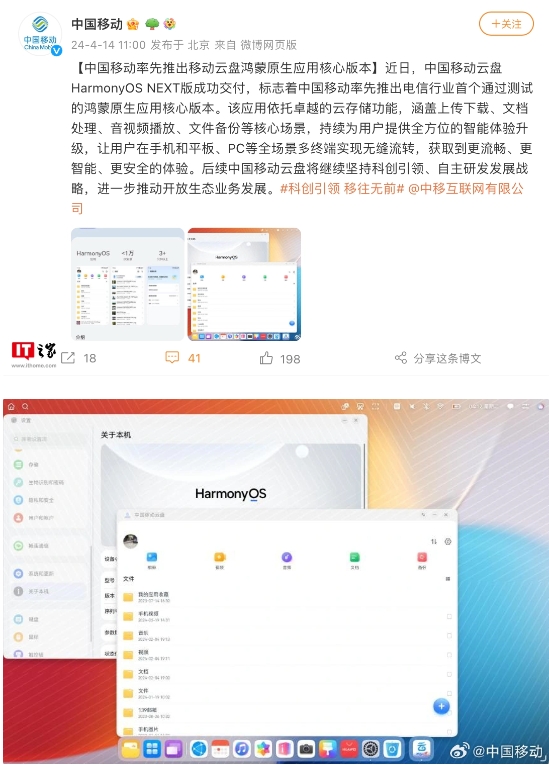 據“中國移動(dòng)”官方微博,中國移動(dòng)近日推出華為鴻蒙 HarmonyOS NEXT 版“移動(dòng)云盤(pán)” 原生 App,標志著(zhù)“中國移動(dòng)率先推出電信行業(yè)首個(gè)通過(guò)測試的鴻蒙原生應用核心版本”。