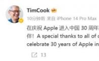 蘋(píng)果公司 CEO 蒂姆?庫克今日早間發(fā)文,慶祝蘋(píng)果進(jìn)入中國 30 周年,并表示“衷心感謝所有的同事、顧客和合作伙伴”。